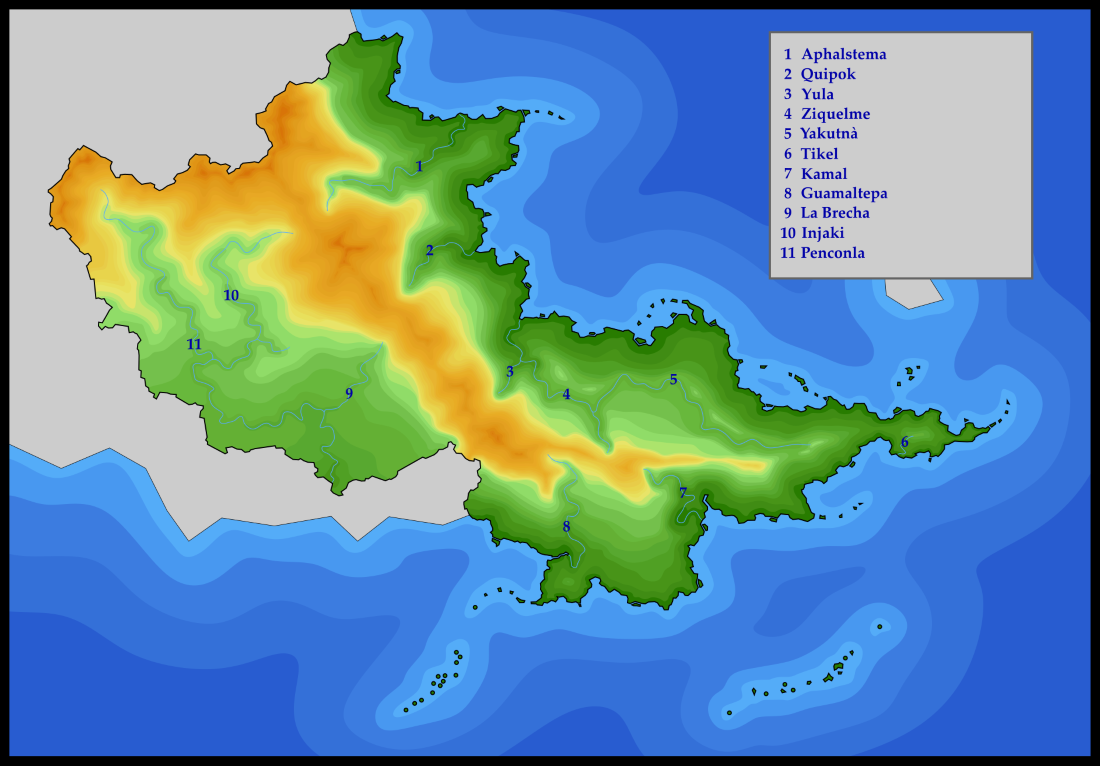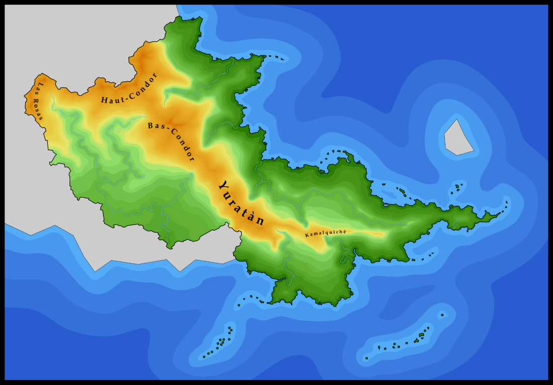 Pour connaitre la Yukanaslavie, il est nécessaire de connaitre des aspects géographiques des principaux territoires qui seront présentés au cours de votre lecture. Ainsi, dans cette sous-partie, il vous sera présenté les différents massifs montagneux de Yukanaslavie, dans sa partie Aleucienne. Lorsque l'on regarde la carte du pays ( voir ci-dessous ), on est surpris de voir un pays "coupé en deux", par une vaste chaine de montagnes s'étendant du nord au sud. Elle semble aussi se diviser en plusieurs parties, du grand nord aux petits massifs du sud. Les géologues et autres scientifiques étudiant les roches ont pu diviser ces sous-parties de manière plutôt précises. Ainsi, nous nous retrouvons avec 5 massifs montagneux différents : Las Rosas, Haut-Condor, Bas-Condor, Yuratàn et Kamalquiché. Leurs dénominations ne sont pas hasardeuses, et trouvent leur origine dans l'histoire du pays. Le premier, Las Rosas, est tout simplement le nom que donne la Costa Sueñoleja à ses montagnes du sud-ouest, et qui se lient à celles de la Yukanaslavie. C'est principalement un geste diplomatique, montrant qu'ils nomment de la même manière une partie de leurs montagnes, et que les discussions sont donc ouvertes. Ce nom est profondément combattu par les populations Hamajaks locales, qui voient cette dénomination comme un vestige du passé coloniale du Nouveau-Saptär. Le second et le troisième, le Haut-Condor et le Bas-Condor, sont directement issus de l'animal le Condor, précisément des Condors du Yuratàn qui migrent une bonne partie de l'année dans ces massifs montagneux pour trouver de la nourriture et un lieu pour se reproduire. Les premiers colons sapythes et kaulthes, observant ces animaux impressionnants dans ces montagnes, ont donc appelé ces dernières Haut-Condor et Bas-Condor. Le quatrième a lui une origine bien plus ancienne et native. Le Yuratàn est un terme que l'on retrouve déjà dans les inscriptions Taquis du premier empire ( vers l'antiquité et le moyen-âge eurysien ). Elle désigne la montagne des dieux, notamment du dieu de la pluie Chac ( au nord du Yuratàn, le territoire était une vaste forêt avec beaucoup de précipitations ), qui aurait permis, selon la légende, collaboré avec Ixmukané, déesse du maïs, afin de permettre aux hommes de se nourir et de prospérer dans le Takàl. A travers les siècles, ce nom va perdurer, notamment grâce à l'indépendance totale du Taqui, passant outre le phénomène des colonisations étrangères. Aujourd'hui, ce nom représente toute la réussite des peuples natifs, ayant survécu aux siècles alors que d'autres se sont vus exterminés à cause d'eurysiens violents. Le cinquième, et le dernier, le Kamalquiché, est lui un nom natif, mais pas dans le sens qu'on pourrait l'entendre. Il faut savoir qu'il a été nommé par le peuple Quichu ( peuple du sud du pays ). Ce dernier est originaire, selon certaines sources archéologiques, de l'Halulla ou bien des îles du Kamaltapente. Vers l'antiquité/moyen âge aleucien, ce peuple, pour des raisons qui échappent encore aux experts, s'est exilé sur la péninsule de l'Occizyan, envahissant le sud de la Yukanaslavie, et provoquant alors la conquête totale de la vallée du Yuratàn au main des nouveaux venus. Finalement, c'est grâce à cette grande chaine de montagne que les Quichus ne s'en sont pas allés plus au nord et à l'ouest, permettant donc la survie des populations Taquis. Le nom de Kamalquiché peut être décomposé en "Kamal" ( Hra'amal en Quichu, qui désigne la muraille, la palissade ) et "Quiché" ( Quiche en Quichu, qui est d'ailleurs un mot intégré du vocabulaire taqui, qui signifie imprenable, insoumis ( c'est par ailleurs de là que vient le nom du peuple en question )). Ainsi, le Kamalquiché, dans sa traduction littérale, signifie la muraille imprenable, insoumise, qui rappelle les échecs cuisants des Quichus de s'emparer des terres du nord.
