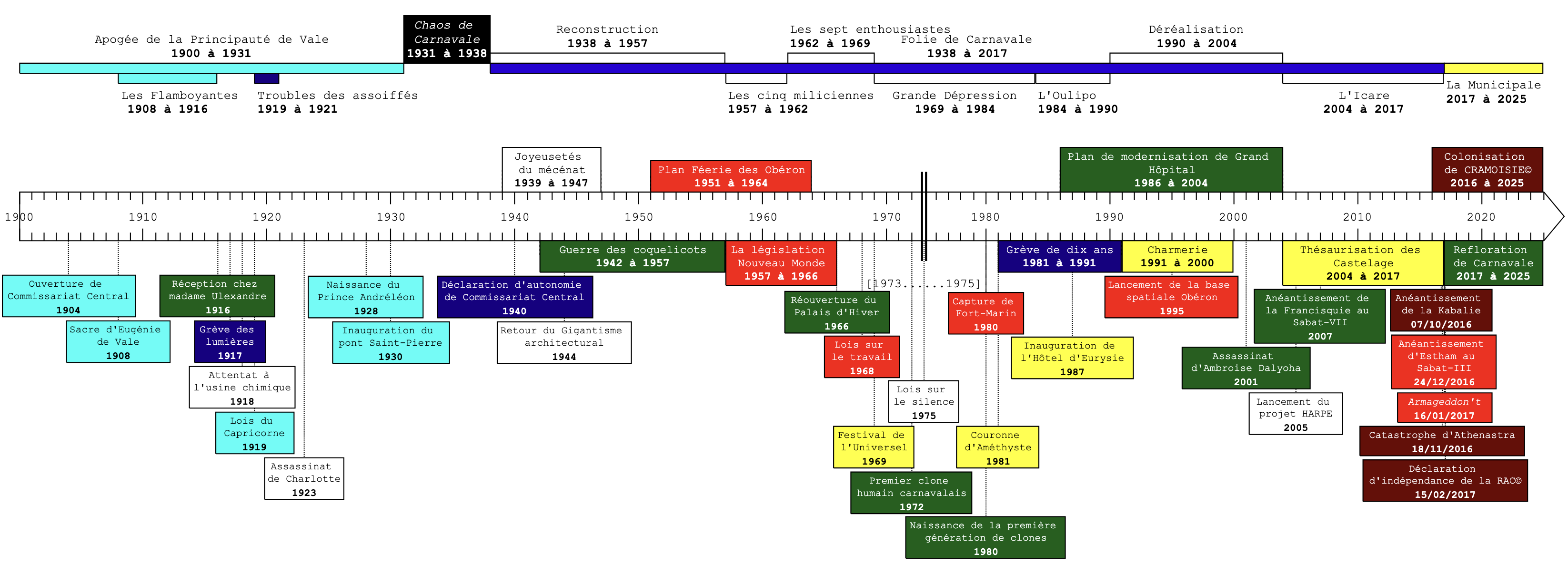 Elle trouva néanmoins ses limites à l'aube du XXème siècle. L'adoption de la révolution industrielle par la Principauté de Carnavale avait considérablement enrichi marchands, bourgeois et grandes familles nobles qui rivalisaient désormais en puissance avec la couronne de Vale. L’État central, affaibli par les pressions d'une puissante noblesse aux dents longues, perdit peu à peu le contrôle sur les rentrées d'argent dans le pays. Incapable de lever efficacement l'impôt en raison de la corruption galopante au sein de son administration et de ses forces de polices, la grande bourgeoisie d'affaire et la vieille noblesse ne tardèrent pas à largement monopoliser les bénéfices du commerce à leur profit, gagnant de ce fait de plus en plus de pouvoir sur les princes de Vale.