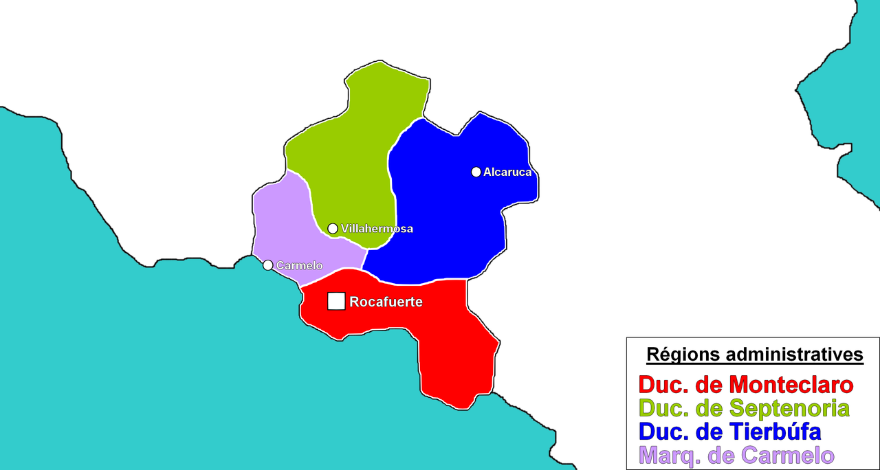 B-Topographie et organisation administrative d'Arobelas : le Ducado de Monteclaro, le Ducado de Septenoria, le Ducado de Tierbúfa et le Marquesado de Carmelo.